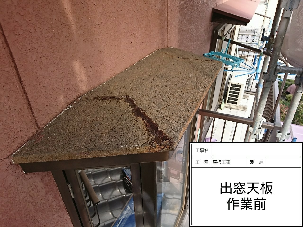 足場組立て、アンテナ撤去、瓦調整、瓦バンセン交換、瓦ラバーロック、出窓天板塗装、波板屋根交換